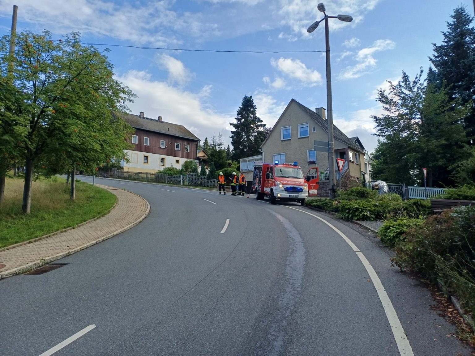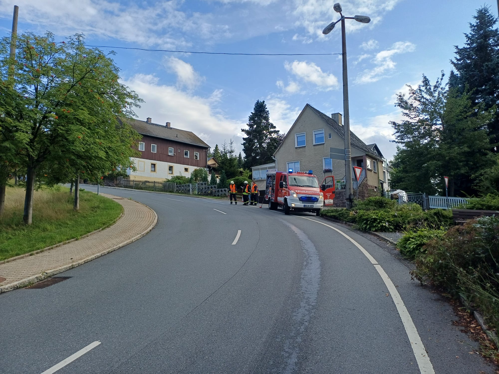 Am 01. August 2025 erhielten wir um 17:43 Uhr die Alarmierung zu einer Ölspur. An der Einsatzstelle in Bärenfels stellte sich heraus, dass es sich um eine Dieselspur handelt. Unsere Einsatzkräfte banden gemeinsam mit den Kameraden aus Schellerhau die Verunreinigung mit geeigneten Bindemittel. Im Nachgang erfolgt noch die Reinigung durch eine Fachfirma. Noch während unserer Reinigungsarbeiten wurden die TSF-W Fahrzeuge aus Bärenfels und Schellerhau zu einem Verkehrsunfall alarmiert.